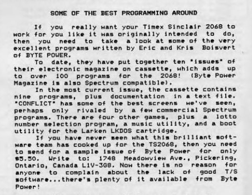 Si nunca has visto lo que este brillante equipo de software ha preparado para el TS2068, solicita una muestra de Byte Power por sólo $5.50. Escribe a: 1748 Meadowview Ave., Pickering, Ontario, Canadá LIV-3G8. Ya no hay motivos para que nadie se queje de la falta de buen software en el T/S… ¡hay mucho disponible en Byte Power!